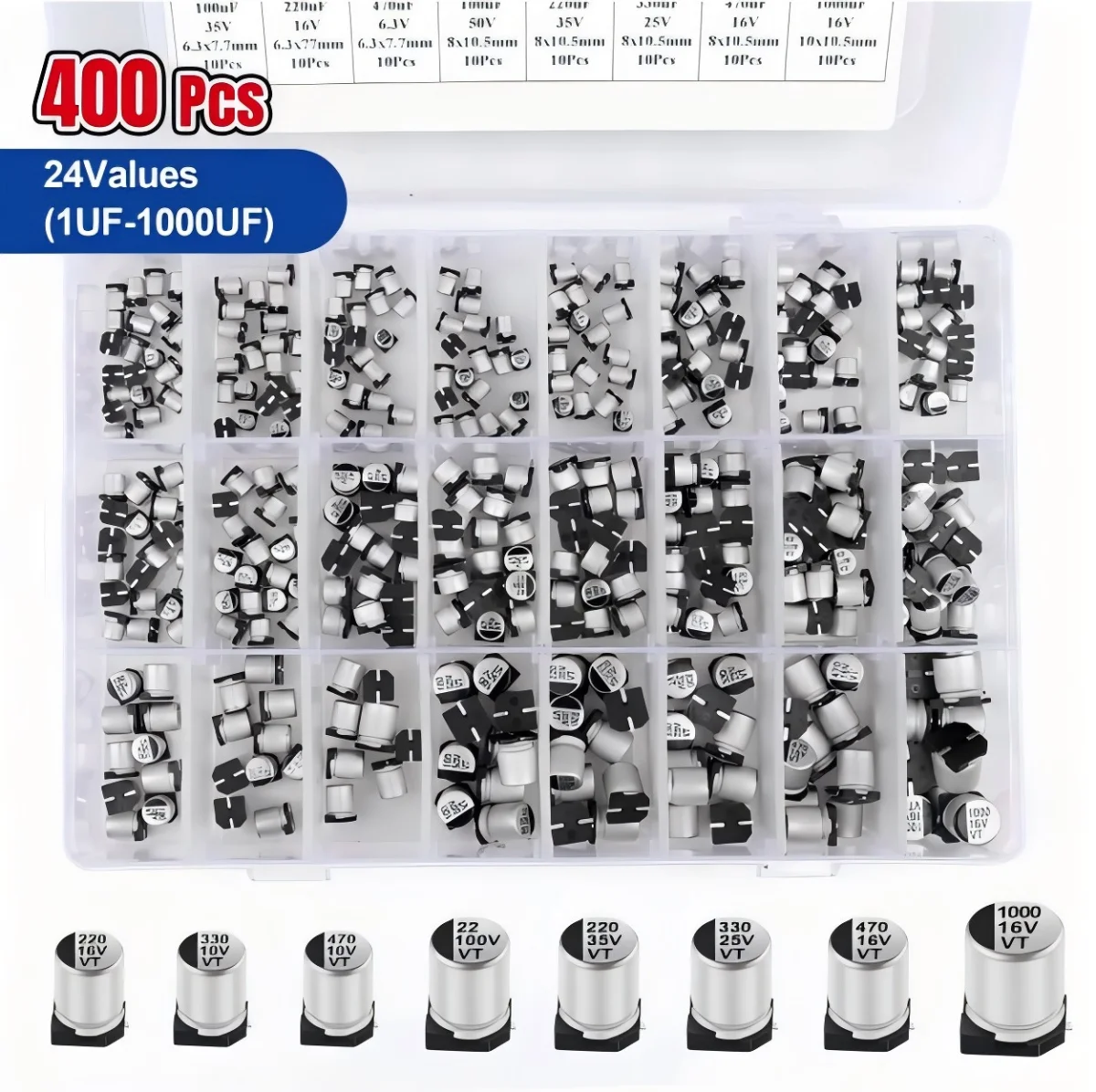 145 pièces/400 pièces kit condensateur électrolytique en aluminium SMD condensateurs electrolíticos 1uF ~ 1000uF 6.3V-50V 10/24 valeur avec kit de boîte