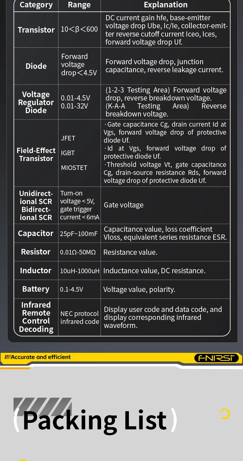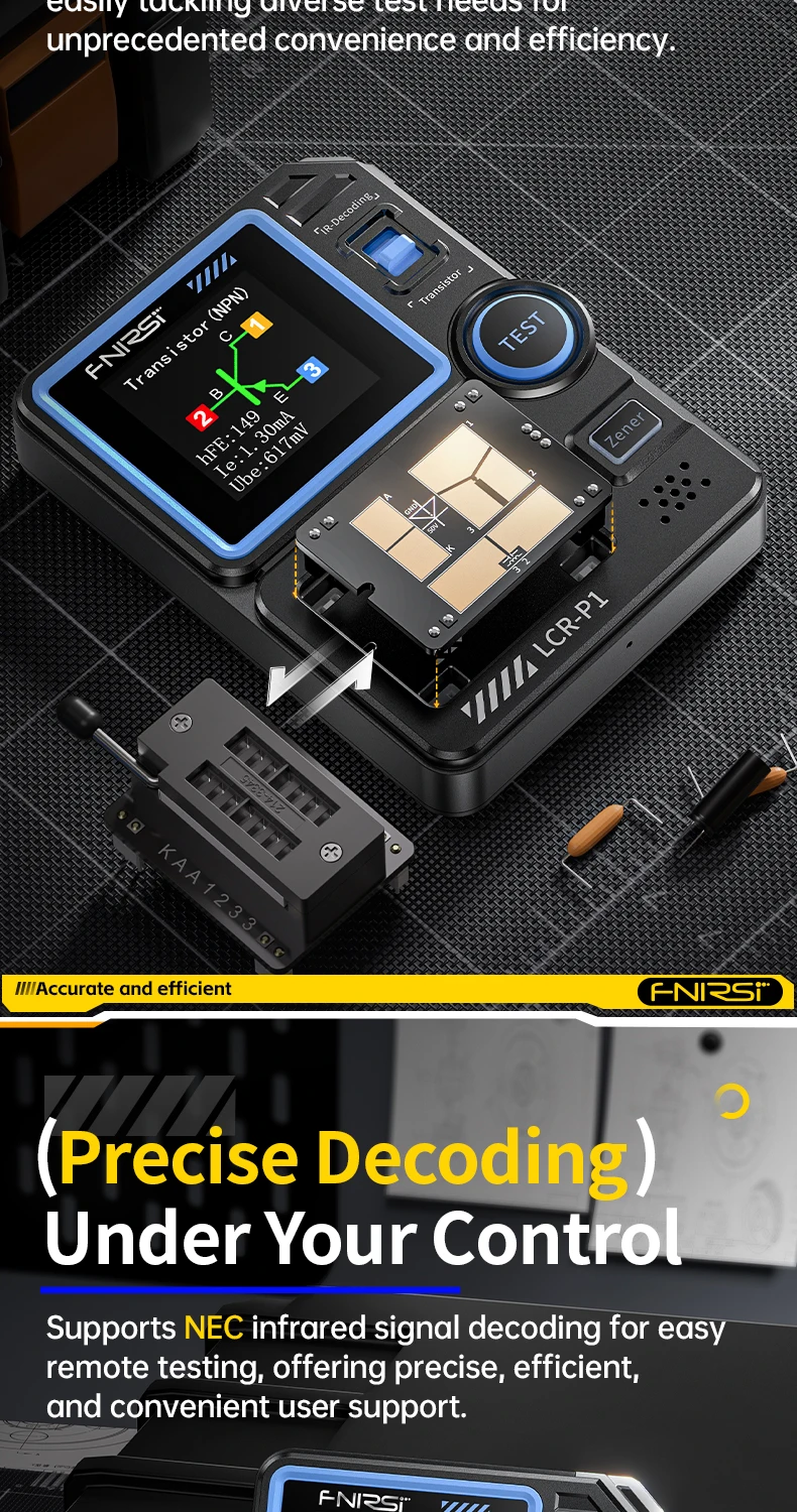 Le Testeur de transistor LCR-P1 Est un dispositif de test électronique de haute précision et multifonctionnel conçu spécifiquement pour les ingénieurs électroniques, les techniciens et les passionnés. Ce dispositif est prévu pour détecter et analyser la représentation et les caractéristiques des composants de semi-conducteur tels que des transistors, des diodes, des triodes, et des transistors à effet de champ (FET). Équipé d'un écran couleur, il permet de mesurer plusieurs paramètres de divers composants, Identifie automatiquement le type et la disposition des broches du composant testé, simplifiant ainsi le processus de fonctionnement et améliorant l'efficacité des tests.